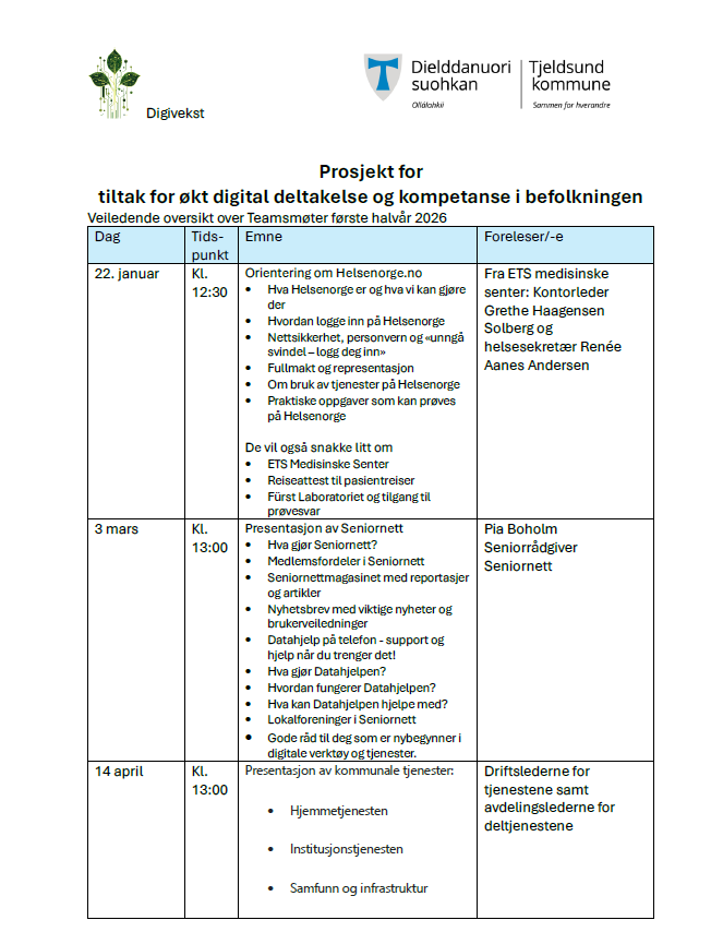 - Drop-in tilbud for datahjelp i kommunesenteret. Ta kontakt med Liv-Marit Torbergsen eller Janne Johansen