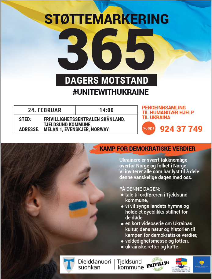 Fredag 24.02.23 arrangeres en markering av 365 dagers motstand, på Frivillighetssentralen på Evenskjer kl. 14.00.