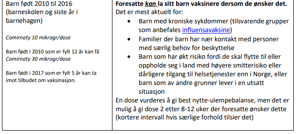 Folkehelseinstituttet har vurdert at vaksinasjon av barn i alderen 5-15 år kan ha positiv nytte, men nytten er begrenset siden risiko for alvorlig sykdom allerede er svært lav. Barn og unge vil også kunne få bred og varig beskyttelse ved å gjennomgå koronainfeksjon. Folkehelseinstituttet mener likevel det er riktig at barn i denne aldersgruppen får et tilbud om vaksine for de som ønsker det.