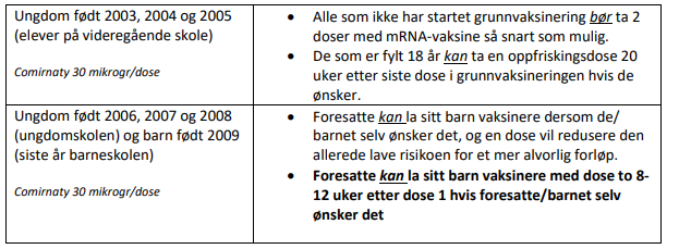 Tabellen under oppsummerer vaksinasjonstilbudet for barn og unge. Uthevet skrift indikerer utvidelse som følger av regjeringens beslutning 14. januar.